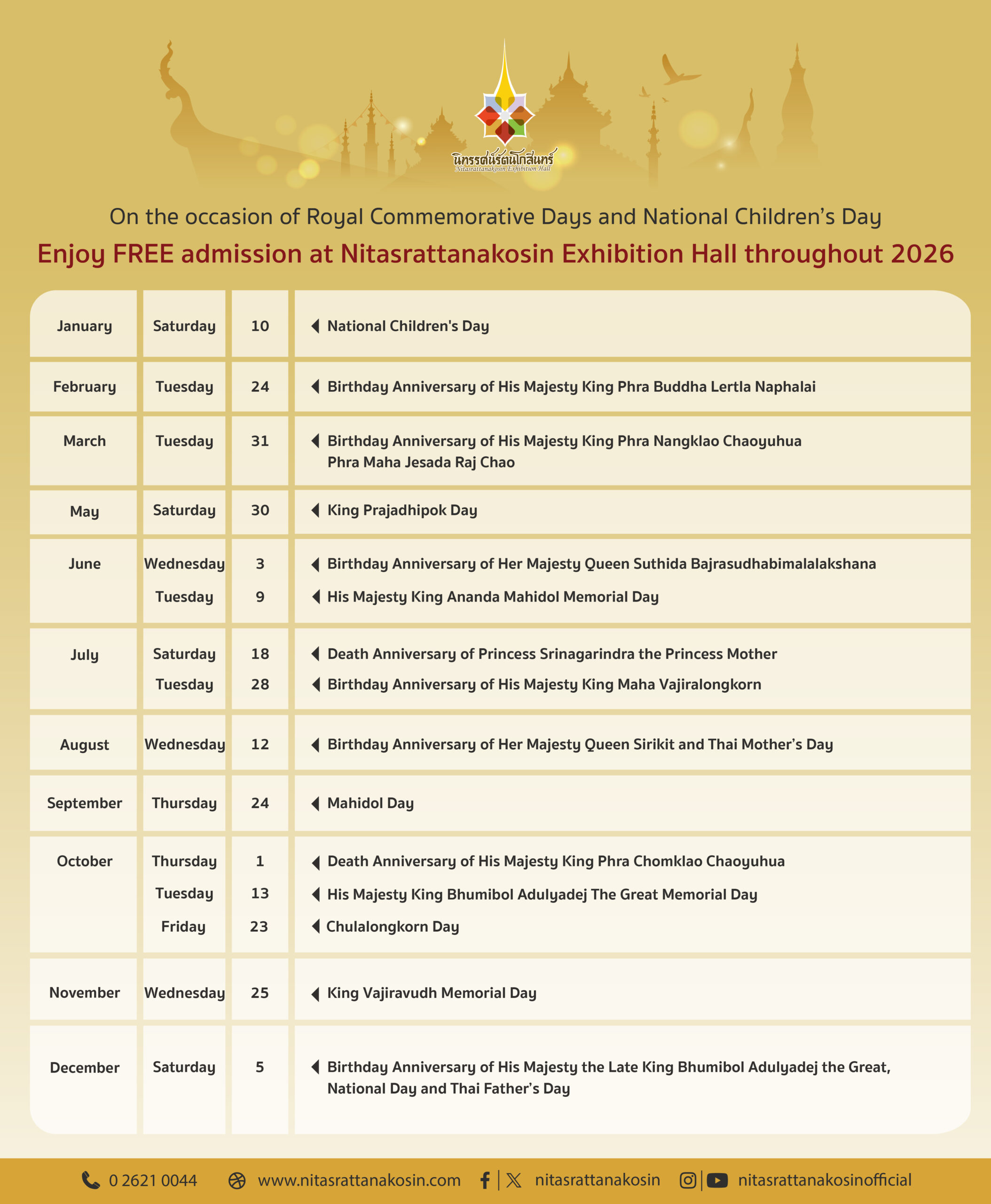 Free entry for children, students, elders, monks and people with disabilities