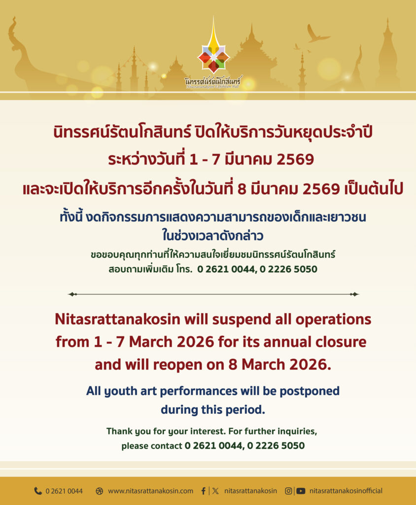 📣 Nitasrattanakosin will suspend all operations from 1 – 7 March 2026 for its annual closure and will reopen on 8 March 2026. All youth art performances will be postponed during this period. ✨