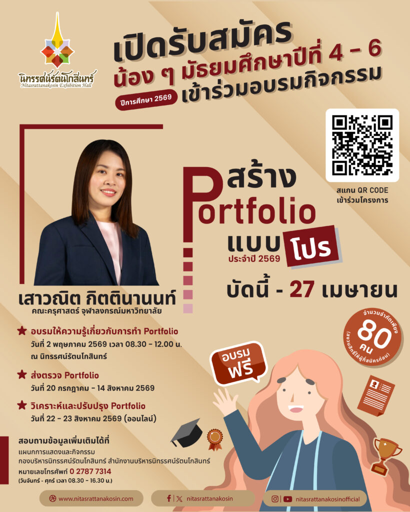 🎯 ทำ Portfolio อย่างไรให้ปัง ✨ 👧‍👦 น้อง ๆ มัธยมศึกษาปีที่ 4 – 6 ไม่ควรพลาด ‼️ 🏛️ นิทรรศน์รัตนโกสินทร์ เชิญชวนเข้าร่วมอบรมกิจกรรม “สร้าง Portfolio แบบโปร” ประจำปี 2569 🏅